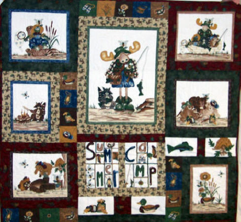 Burgandy, forest green & tan outdoor prints surround whimsical moose, bear & racoon. Top & backing are constructed of quality 100% cotton, batting is thin polyester. Machine pieced and machine quilted by Linda Monasky. 40" x 38" Placename:$75.00 Date added: 31st January 2007 If you are interested in purchasing any of these items, call us at 603 875-2781
