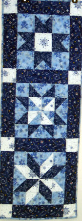 3 different star patterns give this table runner more interest.All fabrics are quality 100% cotton winter prints. Machine pieced and machine quilted by Linda Monasky.